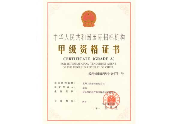 2012.4上投招標(biāo)榮獲中華人民共和國(guó)國(guó)際招標(biāo)機(jī)構(gòu)甲級(jí)資格證書