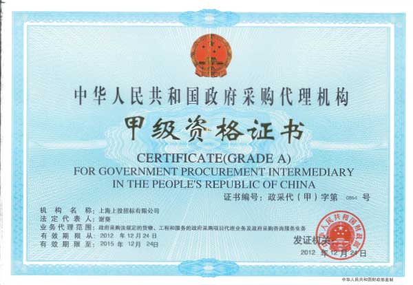 2012.12上投招標(biāo)榮獲中華人民共和國(guó)政府采購(gòu)代理機(jī)構(gòu)甲級(jí)資格證書