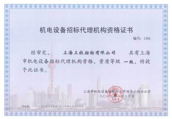 2013.6上投招標(biāo)獲得上海市機(jī)電設(shè)備招標(biāo)代理機(jī)構(gòu)一級(jí)資格證書