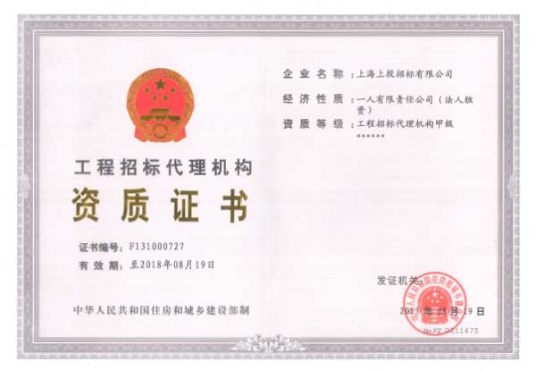 2013.8上投招標(biāo)榮獲中國(guó)住建部頒發(fā)的工程招標(biāo)代理機(jī)構(gòu)甲級(jí)資格證書