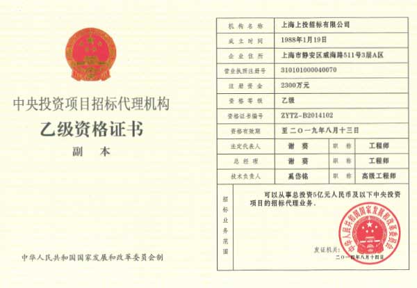 2014.8上投招標(biāo)榮獲中央投資項(xiàng)目招標(biāo)代理機(jī)構(gòu)乙級(jí)資格證書