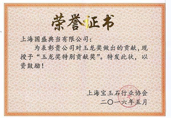 2016.5國(guó)盛典當(dāng)榮獲上海寶玉石行業(yè)協(xié)會(huì)授予的“玉龍獎(jiǎng)特別貢獻(xiàn)獎(jiǎng)”稱號(hào)