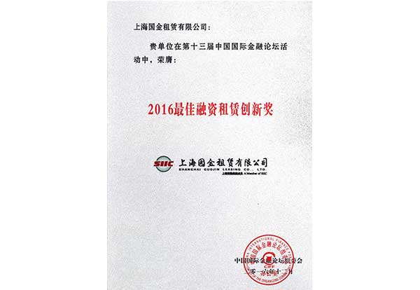 2016.12國(guó)金租賃獲中國(guó)國(guó)際金融論壇頒發(fā)的'2016最佳融資租賃創(chuàng)新獎(jiǎng)'