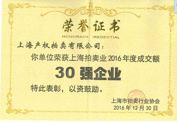 2016.12.30上海產(chǎn)拍榮獲“上海拍賣業(yè)2016年度成交額30強(qiáng)企業(yè)”稱號(hào)