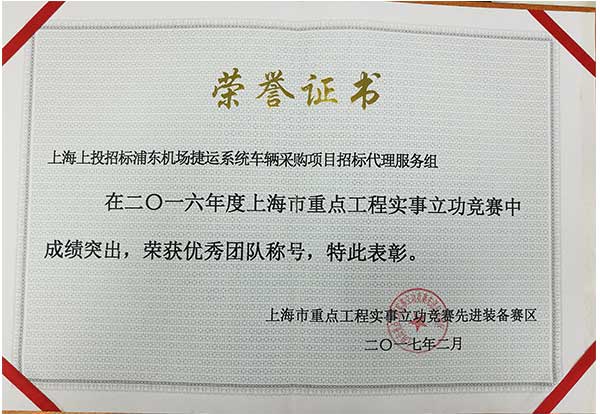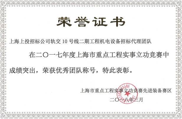 2017.2上投招標(biāo)榮獲“2016年度上海市重點(diǎn)工程實(shí)事立功競(jìng)賽優(yōu)秀團(tuán)隊(duì)”稱號(hào)
